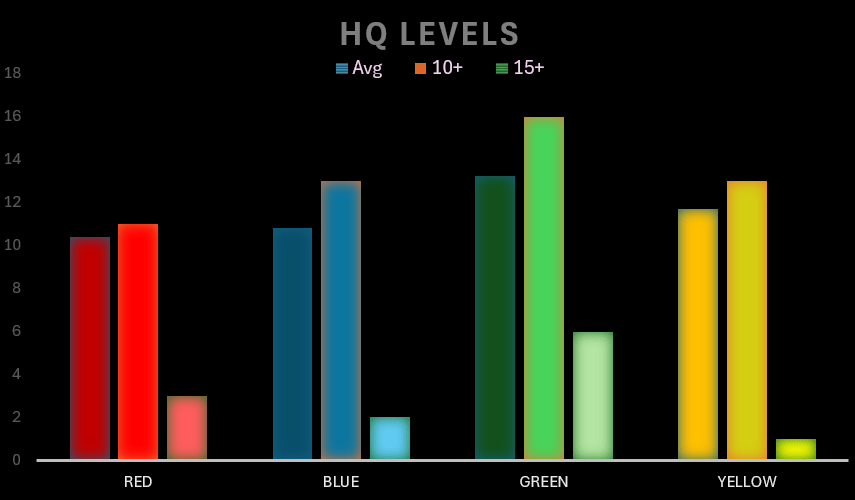 We begin with teams’ levels. We can see Green has a substantial lead in avg HQ, and Yellow lagging in 15+